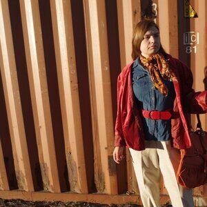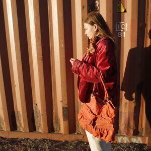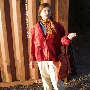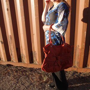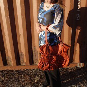 Big vintage burnt orange hand bag .By d-fusion .Vegan leather bag ,in good condition .Great hard wear size is 13 inches wide by 18 inches long.