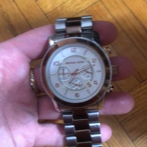 Big faced, silver link band with bronze ish/dark rose gold down the centre. With date setting and stop watch function (I don't know how to use that lol)