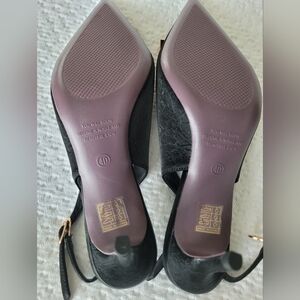 BigTree "NWOT" Slingback Heels in Size 40/9US. Black pointed toe satin Like Fabric with Bronze Tone Hardware "G" Letter on top of the shoes. Gorgeous shoes. Please Refer to All attached photos prior to purchase.