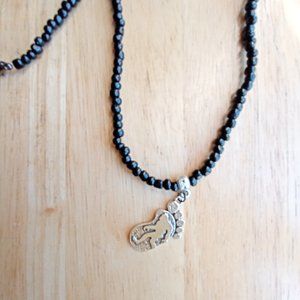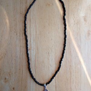 Handmade black beaded charm necklace is 20" long.
