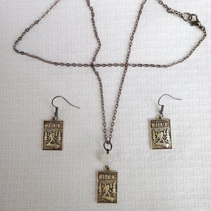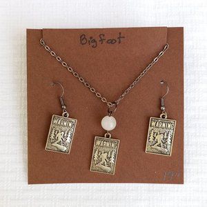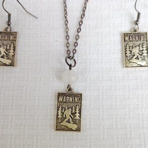 Handmade Earrings & (Moonstone) stone bead chain necklace with Bigfoot Sasquatch "Warning" charms.