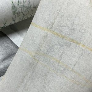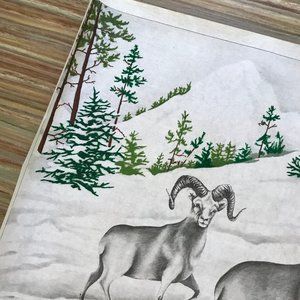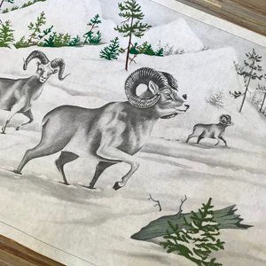 Tri-chem/Artex pre-printed fabric for liquid embroidery painting has partially completed design Bighorn Sheep/Rams. Most of the trees have been colored/painted with the rest of the design in grayscale. Can be displayed as is, or complete to your preference. Fabric is 26" wide x 38" long. Partially completed Artex/Tri-Chem painting, white fabric has some discoloration around edges from age/storage, some creasing to fabric, has yellow adhesive marks/streaking on the back of fabric.