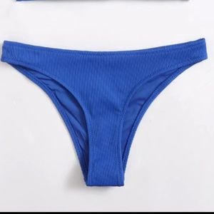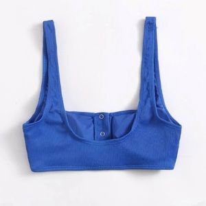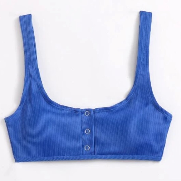 3 button bikini top with bottoms. Buttons are able to be undone to customize neckline. Ribbed material. Never worn, tried on. Thought I would wear but I just never grab for it.