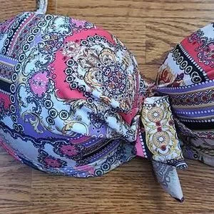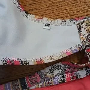 Top is like a bra fit with snap closure at back and has a detail tie in the middle. Tag says 48 D but fits 46 D too.