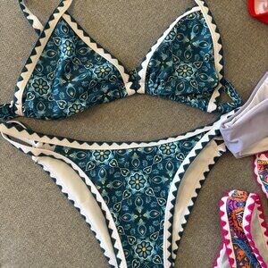6. Turquoise Patterned Set โ Boho style with zigzag trim, triangle top