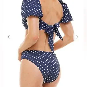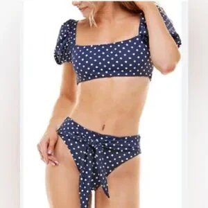 A super cute bikini set featuring a French style square neck bikini top with short puffed sleeves and a tie on the back.