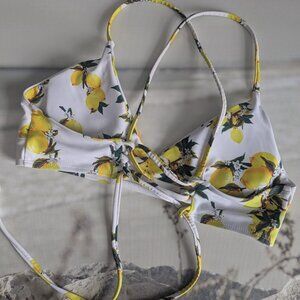 Adorable double lined Bikini , lemon print , tie up corset style back for custom fit , EC like new