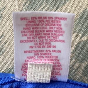 Blue with colourful crochet trim bikini top. Adjustable straps for width and length. Padded. Purchased US$.