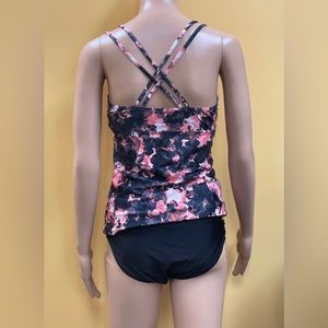 Two Piece Pink/Black Tankini Swimsuit. Tummy Control. Cross-Cross Straps. Fully lined. Built in Bra with Removable Cups