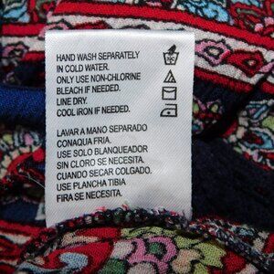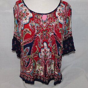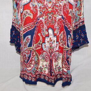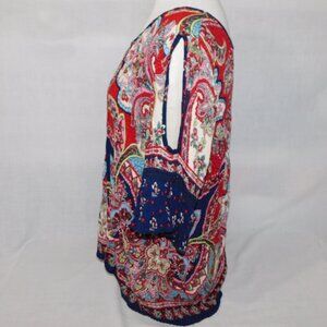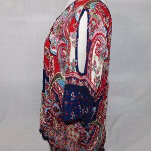 This stunning Womens XL BILA Cold Shoulder Multicolor flowy Red blue pink green crinkle Short Sleeve Peasant Blouse / Top is in Excellent clean bright condition. Top is 100% Rayon - hand wash - line dry. Top has circular / oval cut out on each shoulder.