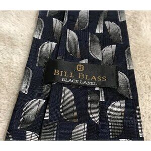 This Bill Blass Black Label tie showcases a sophisticated blue and silver geometric leaf pattern. Crafted from premium silk, it adds a touch of elegance and style to any professional attire.