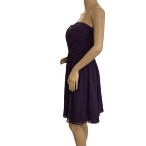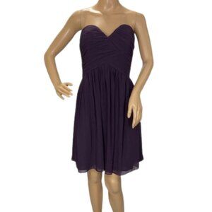 Step into timeless elegance with this stunning Bill Levkoff strapless chiffon dress in a rich, deep plum hue—perfect for weddings, formal events, or special evenings out. The bodice features a flattering sweetheart neckline with soft pleating that enhances the bust and adds gentle texture. The empire waistline elongates the figure and creates a classic, feminine silhouette. Crafted from lightweight chiffon, the skirt flows beautifully and hits just above the knee, offering the perfect balance of grace and movement. A hidden back zipper ensures a smooth, comfortable fit while keeping the look sleek and polished. Whether you're a bridesmaid or a guest, this dress combines classic charm with modern simplicity—ideal for dressing up with your favorite heels and accessories.