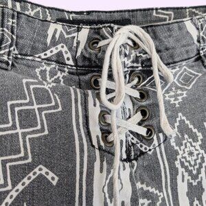 These shorts by Billabong are made of a cotton/elastane blend (98/2) and are a dark grey with a white Aztec/southwestern pattern. The shorts have an inner snap and front tie closure, standard pockets (2.5 front, 2 back), belt loops, and a fringe bottom. There are a couple "distressed" patches on the front as well. The shorts have normal wear and I've been wearing them for years, I just feel too old to wear something so cheeky (which these are, you know what I mean?). The only thing that might affect wearability for you is the length and the amount of skin shown. Worth mentioning, despite the colours and pattern, these are best classified as denim shorts.