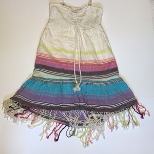 EUC Billabong boho cream and multicoloured striped cotton dress with ruched bust, adjustable straps, and bottom tassels in women’s size small (S).