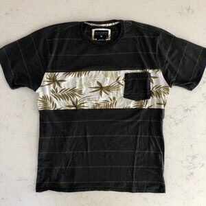 Features: short sleeve, crew neck, stripes, palm leaf print on chest, 1 chest pocket, cotton poly blend, casual, beach, surf, summer