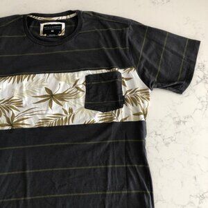 Billabong Casual Surf SS Crew Neck Striped Cotton Poly T Shirt w Palm Leaf Design in Brown Olive Green & White