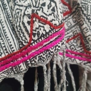 Billabong light weight kimono swim cover up with fringe. Aztec print and pretty stitched border. Says sz M/L on one tag and the content tag says S/M. 100% Cotton. Shoulder to hem above fringe approximately 27". Laid out on flat surface pit to pit is 41". Fringe is fuzzy and very faint yellowing on the neck as shown in last picture. Hanger straps cut out of the inside.