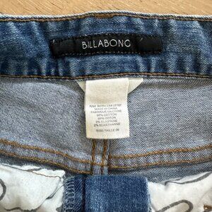 Keywords: Billabong Shorts, Size 26, Low-Rise Cutoff, Frayed Hem, Patterned Denim, Summer Beachwear, California Style, Distressed Jean Shorts, Festival Denim, Surfer Girl Style, Cotton Blend Denim