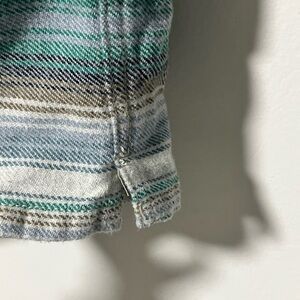This Billabong hooded button-down shirt in size Medium combines casual style with extra warmth, perfect for laid-back days or cool evenings. Featuring a woven green, gray, and white stripe pattern with a cozy attached hood, it offers a relaxed fit that’s versatile enough for layering or wearing on its own. Crafted from a soft 85% cotton blend for breathable comfort, this shirt jacket has button closures, a front pocket, and a rugged look.