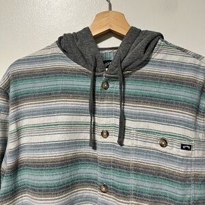 Billabong Men’s Hooded Button-Down Shirt Jacket M – Green Gray Striped Lightweight Layer