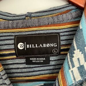 Billabong casual Men's Striped Hoodie Shirt. Featuring a stylish blue and brown stripe pattern, this shirt offers both comfort and style. Perfect for any casual outing. Size large like new