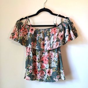 Cute little top with adjustable shoulder straps and drop ruffle sleeves. Coral, pink, and sage colors, super cute with denim shorts or a skirt.