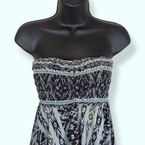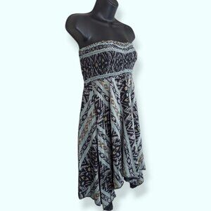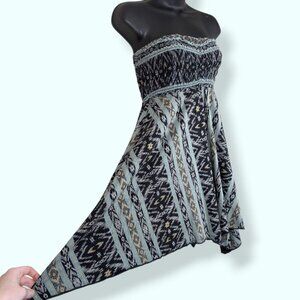 This dress by Billabong is made of a cotton/modal blend (55/45) and features a southwestern-style pattern in black, white, yellow, and a pale turquoise. The dress is strapless with an elastic bust and while it did once have removable straps, they're long gone. Below the bust, the dress is flowy and loose with a kerchief cut. There is a small round metal disc in the middle of the back (towards the top) that says Billabong, which needs a new top stitch holding it in place.