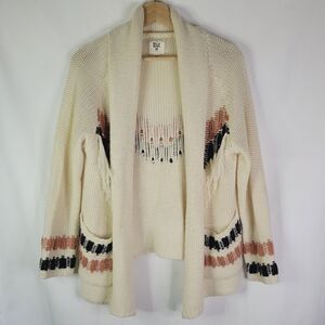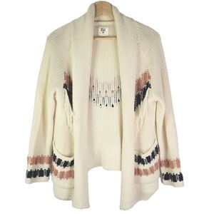 Cozy cream colour open front style acrylic knit sweater cardigan with tassle fring detailing and contrast V knit pattern in black and dusty rose. Perfect for layering in most seasons. 2 front pockets. EUC.