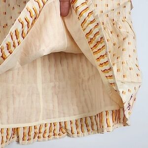 Excellent pre-owned condition, Billabong women's a-line tiered skirt in a pale yellow with all over tiny patterned pink and dark yellow print, fully lined, size medium.