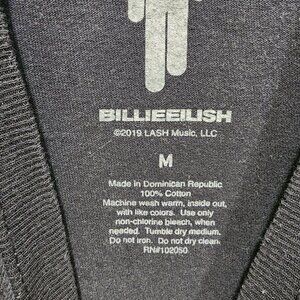 Show off your fandom with this Billie Eilish graphic t-shirt featuring her iconic spider design. This unisex medium-sized t-shirt, made in 2019 by Lash Music LLC, showcases a bold graphic of Billie with a purple hairstyle on a black 100% cotton shirt. It's pre-owned but in good condition, with slight signs of wear consistent with previous use. Perfect for casual wear, concerts, or as a collector's piece for Billie Eilish fans.