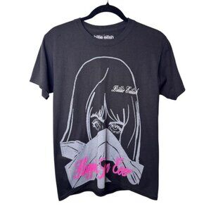 A black Billie Eilish t-shirt, which is an official merchandise from her "Happier Than Ever" era. Features a stylized illustration of Billie Eilish with her hair covering part of her face, and her hands holding a piece of fabric near her mouth. The shirt's style aligns with contemporary music merchandise, specifically reflecting Billie Eilish's aesthetic during her "Happier Than Ever" album cycle. It features a dark color palette with a prominent graphic, characteristic of casual wear and fan apparel.