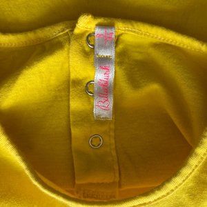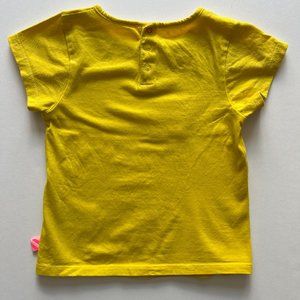 Billieblush kids, bright yellow t-shirt. Kitty looking through a donut with its tongue sticking out. The donut has gems sewn onto it. There are three snaps on the back. The T-shirt is 100% cotton. Great condition, no holes or stains. Size 3 kids