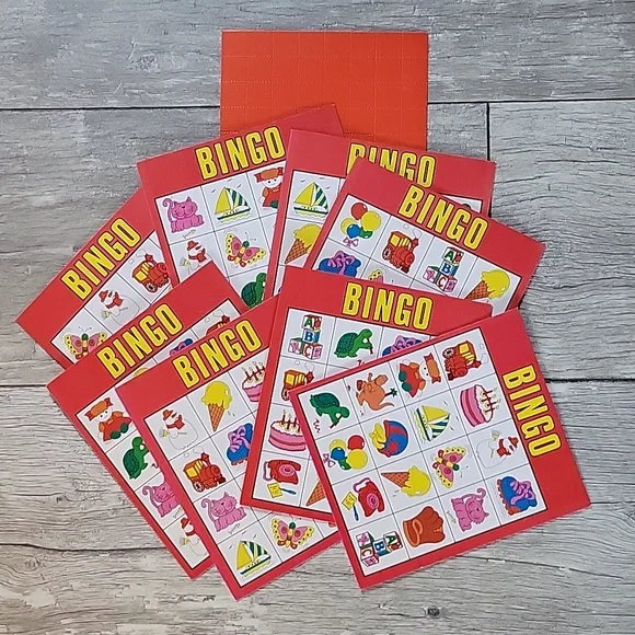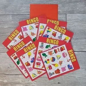 Reuseable bingo game, 8 different cards. 1 perforated sheet of reuseable bingo markers to mark the place.