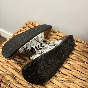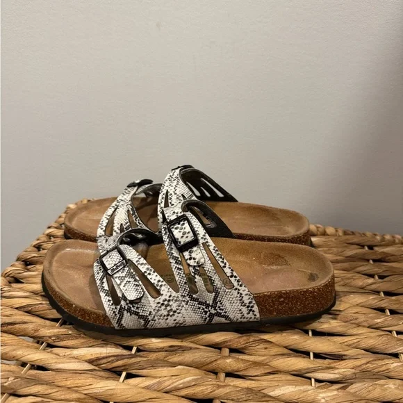Stylish sandals with a snakeskin pattern. Features a comfortable cork sole.