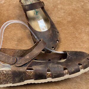 Step into comfort and timeless style with these BioNatura leather Mary Jane shoes. Handcrafted in Italy, these shoes feature a supple leather upper with a rustic distressed finish, a cushioned leather insole, and a supportive cork midsole for all-day wear. The adjustable Velcro strap ensures a secure fit while maintaining the classic Mary Jane silhouette.