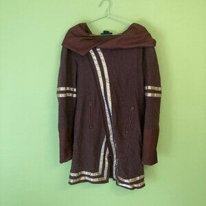 Long angled zipper women's jacket in wool-blend fabric with cowl-style hood, thumb-hole sleeves, zipper pockets and gold trim. In good condition, rarely worn.