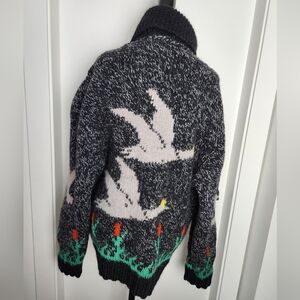 Vintage 1950 to 60s, flying White Geese or Ducks with Yellow heads, Red & Green Flower Tulips, black thick ribbed collar and hem, 'FLASH' zipper, Great Vintage Condition, no tags, a tiny bit of shrinkage (could be stretched but doesn't affect wear), Fits Size XL, Shoulder-22, Pit-27, Sleeve-28, Length-28.