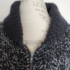Unique pattern heavy black & white ribbed hand knit zipup Cowichan cardigan sweater jacket with front pockets.