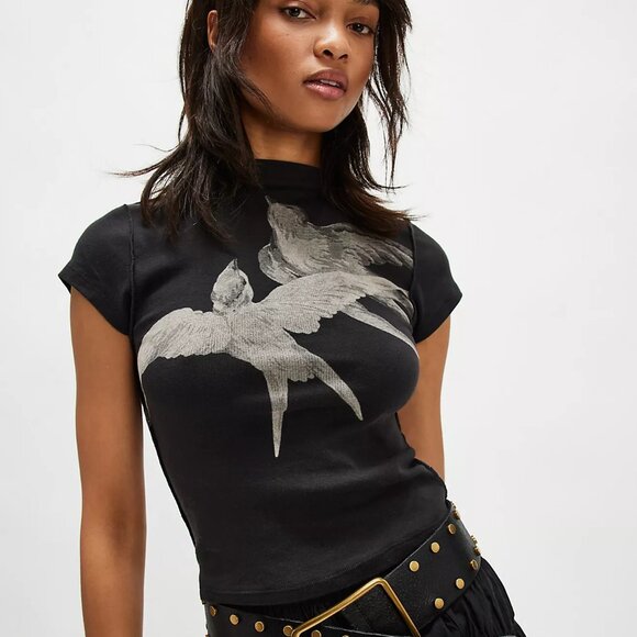 A stunning bird graphic transforms this basic baby tee from Ragabond from staple to statement. Color is Blk / Noir. Size M