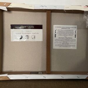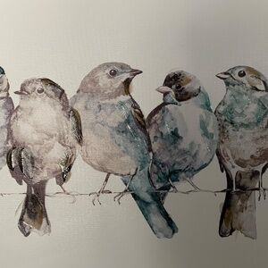 Soft muted tones of greys and blues. Some raised paint enhancements.