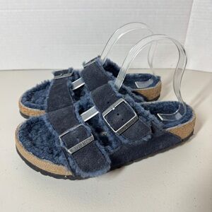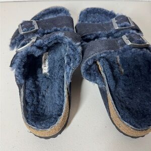 Birkenstock Arizona Shearling Sandals Navy Blue Suede Women’s 39 Fuzzy Cozy Slides