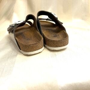 Birkenstock $ 75 - Size 41 /US 10.5/11 Colour Silver. They are preloved and have some wear on the soles but are otherwise in great condition. When new they cost $140 - In great condition and sanitized and cleaned !! Made in Germany. PLEASE SEE MY OTHER BIRKENSTOCK LISTINGS ! Contoured cork footbed conforms to the shape of your foot and features pronounced arch support, a deep heel cup, and roomy toe box; lined with suede Lightweight sole for cushioning and shock absorption