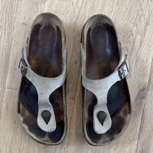 Stylish sandals with a cream upper and brown footbed. Features adjustable strap for a custom fit.