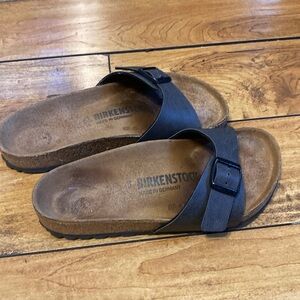 Elegant dark leather sandals with embossed branding. Ideal for everyday comfort.