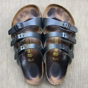 Birkenstock Florida sz 36 three strap black leather slip on sandals slides