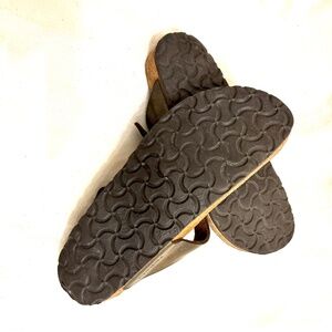 Birkenstock Gizeh $ 85 - Size 38/ US 7-7.5 Brown. They have been tried but did not get much wear and are in LIKE NEW condition , no wear on the soles and you can see on photos. When new they cost $130 - In like new condition and sanitized and cleaned !! Please understand that even though this shoe was only tried on a few times and in mint condition, we still send it through a professional rigorous cleaning , which includes scrubbing the suede in-sole which can result in removal of the branding imprint at times. But we are sure you prefer a supper clean shoe over the brand print. Made in Germany. PLEASE SEE MY OTHER BIRKENSTOCK LISTINGS ! Contoured cork footbed conforms to the shape of your foot and features pronounced arch support, a deep heel cup, and roomy toe box; lined with suede Lightweight sole for cushioning and shock absorption. #A07