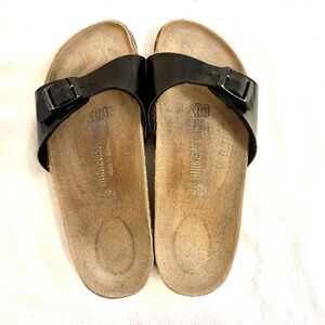 Birkenstock Madrid $ 55 - Size 37/ US 6-6.5 Black They are preowned and you can see some wear, please see on photos. When new they cost $130 -Sanitized and cleaned !! Made in Germany. PLEASE SEE MY OTHER BIRKENSTOCK LISTINGS ! Contoured cork footbed conforms to the shape of your foot and features pronounced arch support, a deep heel cup, and roomy toe box; lined with suede Lightweight sole for cushioning and shock absorption