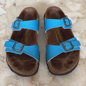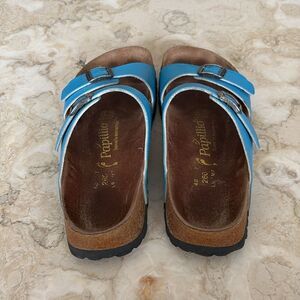 In excellent preowned condition lovely Birkenst Papillio Arizona sandals. Bright blue Birko Flor, cork and soles in great shape. Classic styling, unisex design.