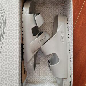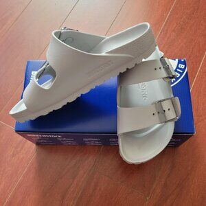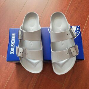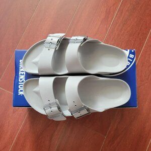The Birkenstock Women's Arizona Stealth Buckle EVA in Stone Grey is a lightweight, waterproof sandal featuring translucent buckles and a contoured footbed for all-day comfort.