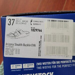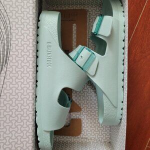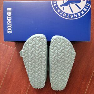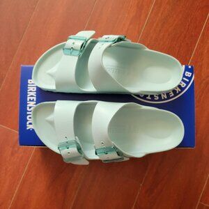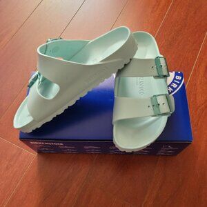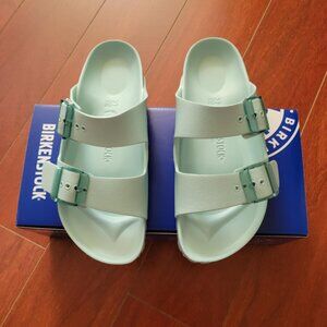 The Birkenstock Women's Arizona Stealth Buckle EVA in Surf Green is a lightweight, waterproof sandal featuring translucent buckles and a contoured footbed for all-day comfort.